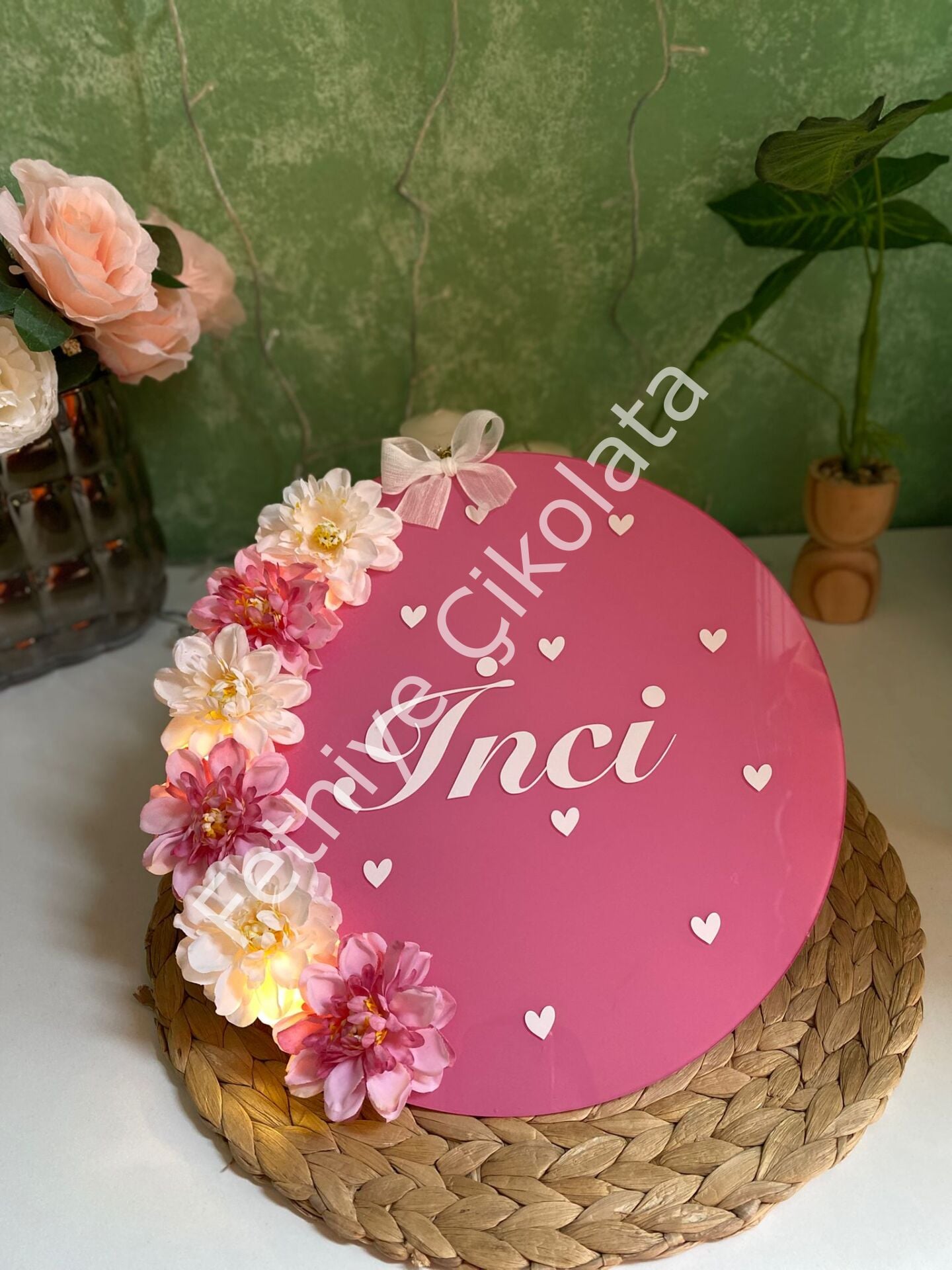 Canlı pembe zemin üzerine zarif çiçek süslemeleri ve sıcak LED ışıklarıyla tasarlanan bu özel kapı süsü, isme özel hazırlanır. Minimal kalp detaylarıyla bebek odaları ve özel günler için şık ve anlamlı bir dekor