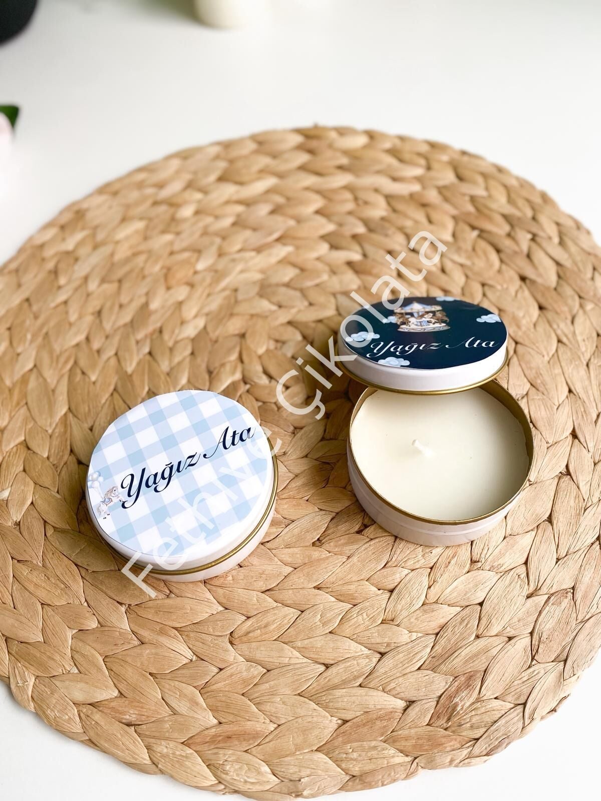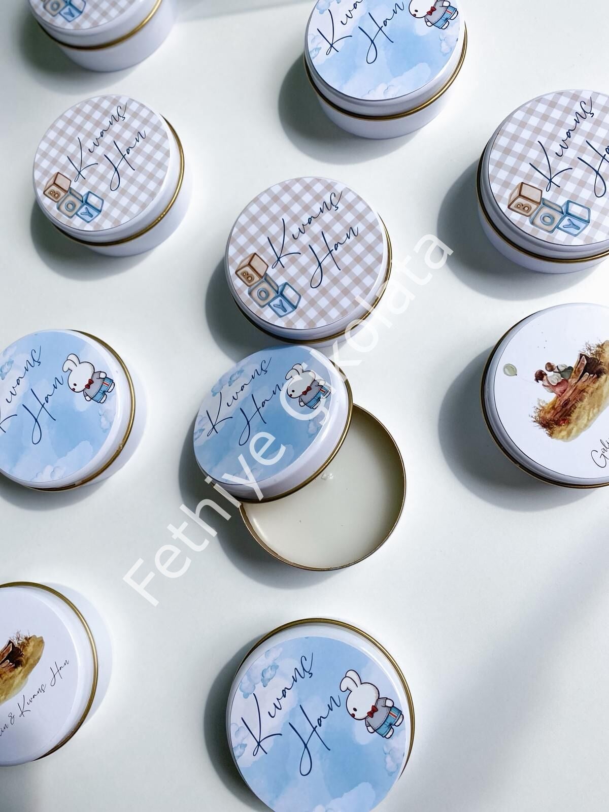 İsme özel tasarlanan bu mini teneke mum, bebek ziyaretleri ve özel günler için zarif bir hatıra. Sade tasarımı, hoş kokusu ve kullanışlı yapısıyla misafirlerinize uzun süre eşlik edecek anlamlı bir hediyelik.