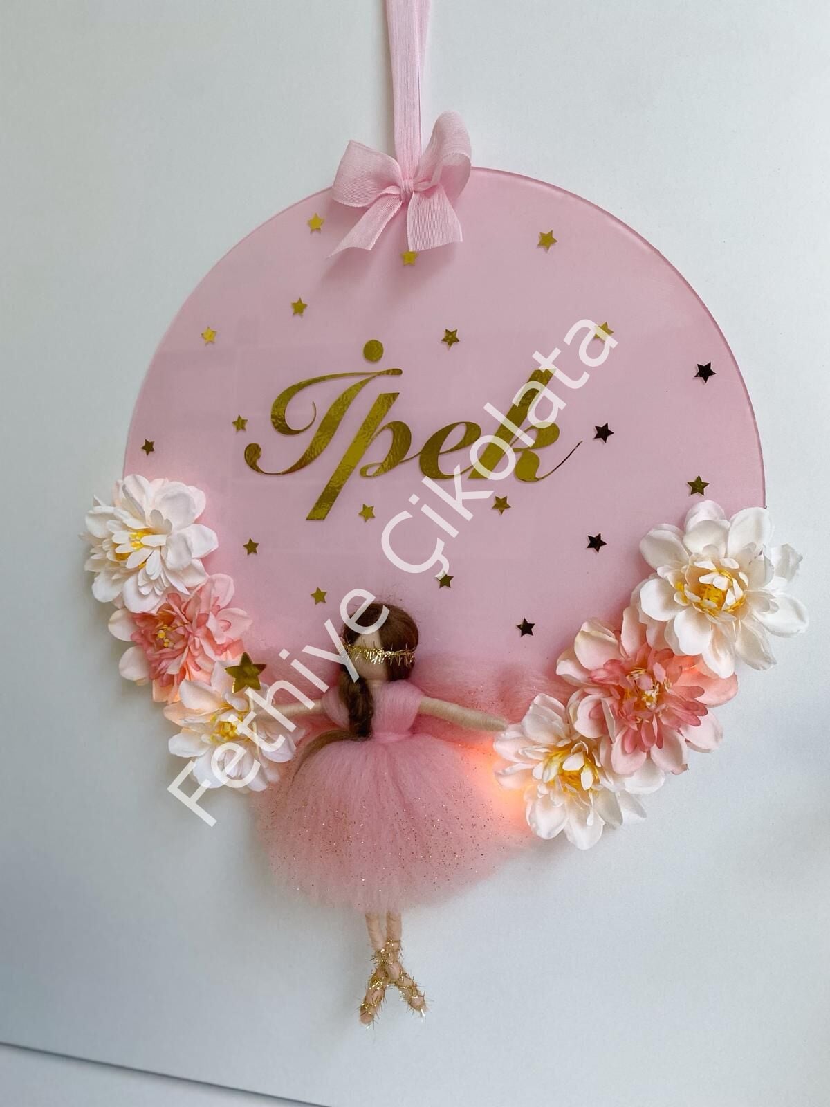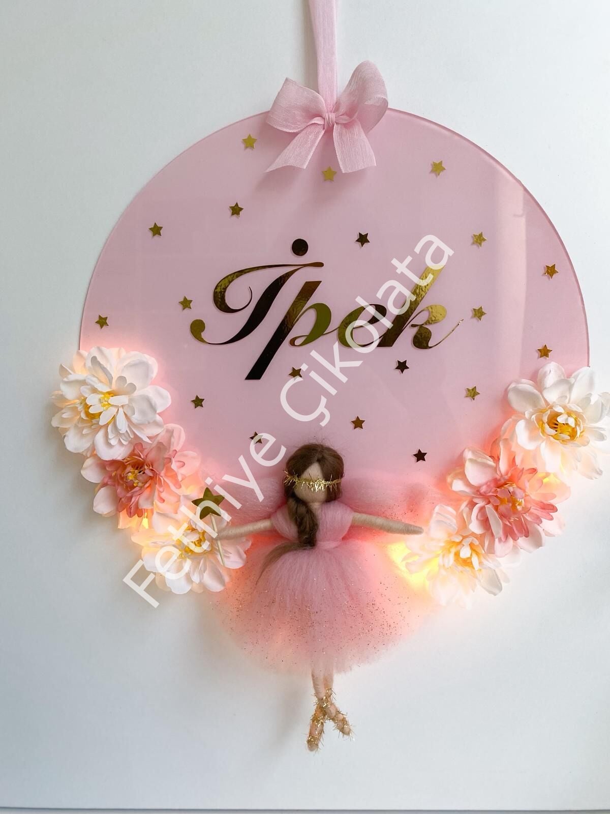 Zarif peri kızı figürü, çiçek detayları ve sıcak LED ışıklarıyla tasarlanan bu özel kapı süsü, isme özel hazırlanır. Pastel tonları ve altın dokunuşlarıyla bebek odaları ve özel günler için hem şık hem de büyüleyici bir dekor