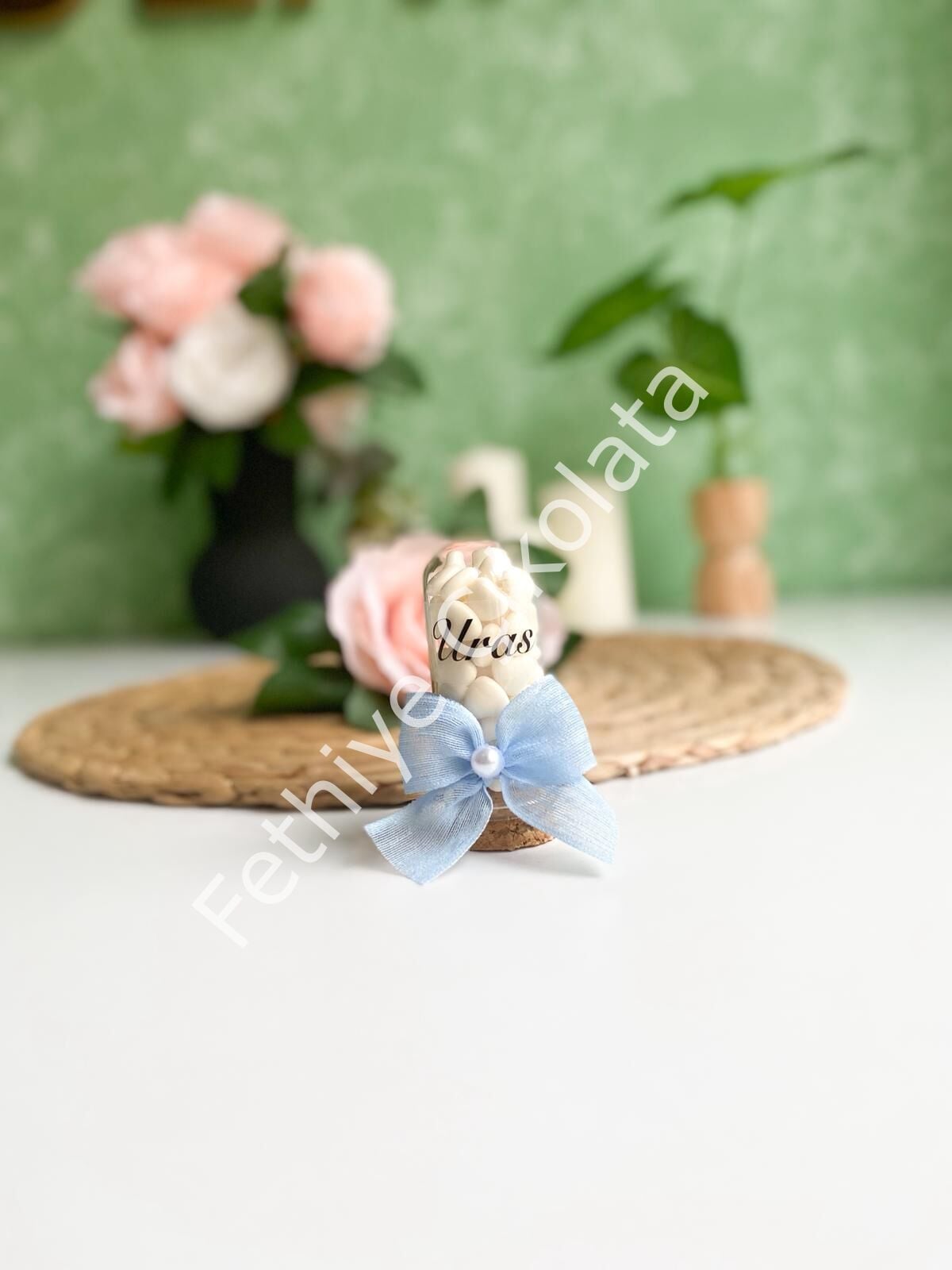 İsme özel hazırlanan ters tüp fanus hediyelik, içindeki kalp draje şekerlerle sevdiklerinize tatlı bir sürpriz sunar. Zarif kurdele detayı ve sade tasarımıyla bebek ziyaretleri ve özel günler için şık bir hatıra olarak hazırlanır.